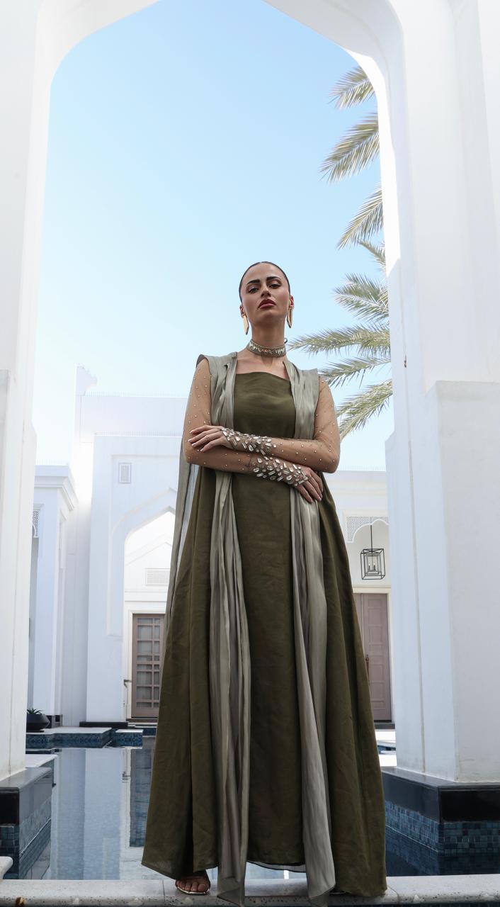 جلابية من اللنن الطبيعي باللون الزيتي وأكمام من التل المشغول بالكريستال الذهبي مع دقلة من الحرير وربطة على الرقبة