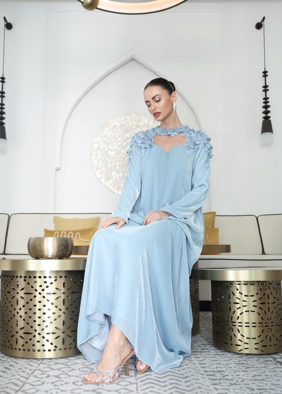جلابية من المخمل الحرير الطبيعي باللون السماوي ومزينه بورود من شيفون الجرجيت مقصوص بالليزر المشغوله يدويا بقصه انثويه من الصدر مغطاة بالتل الشفاف