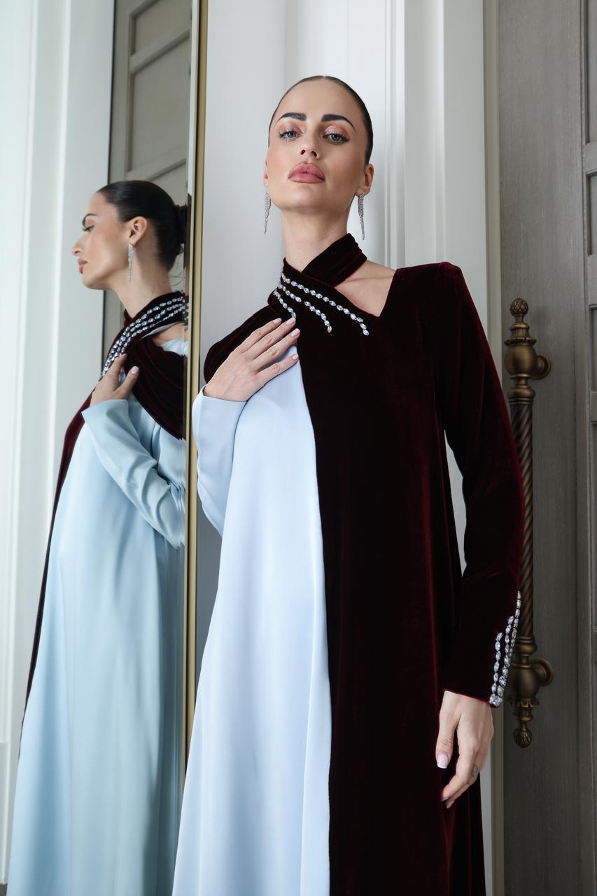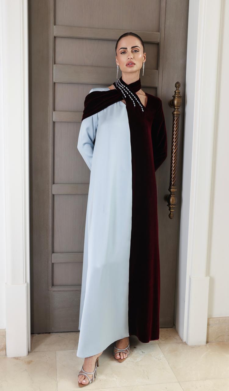 جلابية مدمجة بنوعين من القماش المخمل البرغندي والكريب السماوي وقصه من الياقه متضاربه ومشغولة يدويا بالكريستال السويسري باللون السماوي
