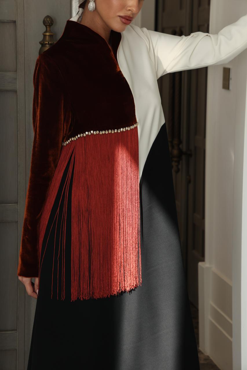 جلابية من الكريب الأسود وقصات انسيابيه من الكريب السكري والمخمل الطوبي منسوجه بالهدب الطوبي ومشغولة يدويا بالكريستال السويسري العسلي