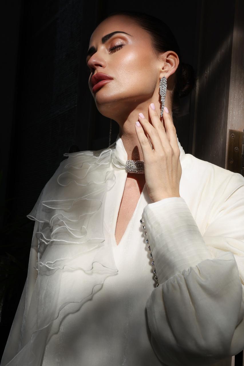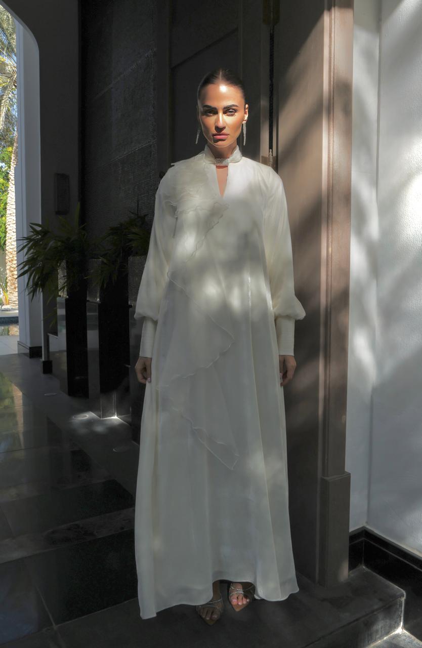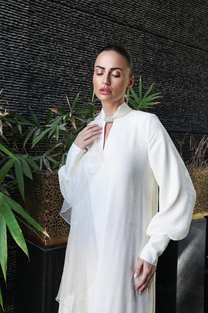 جلابية من المخمل الطبيعي باللون السكري وطبقات من الأورجنزا الطبيعي بقصات مبرومه وياقة مشكوكة بالكريستال السويسري