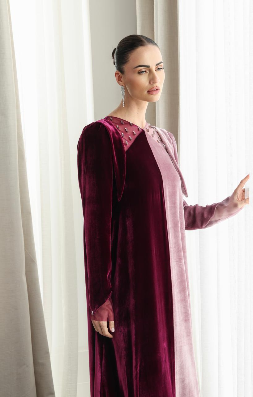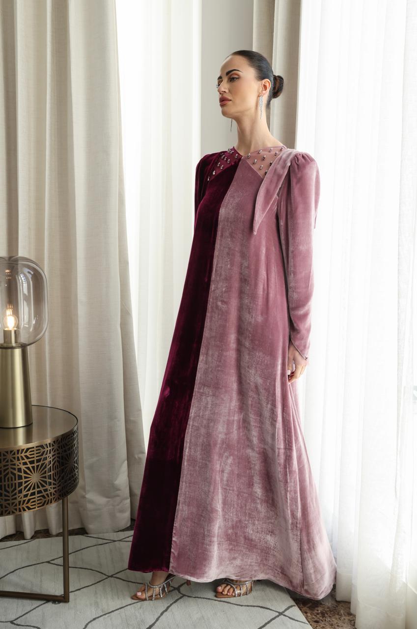 جلابية من المخمل الحرير الطبيعي بلونين الوردي والتوتي وقصة تل من الياقه مشغولة يدويا بالكريستال