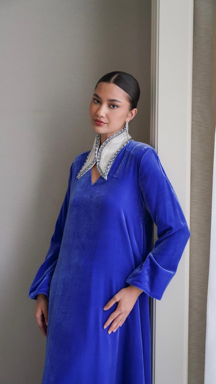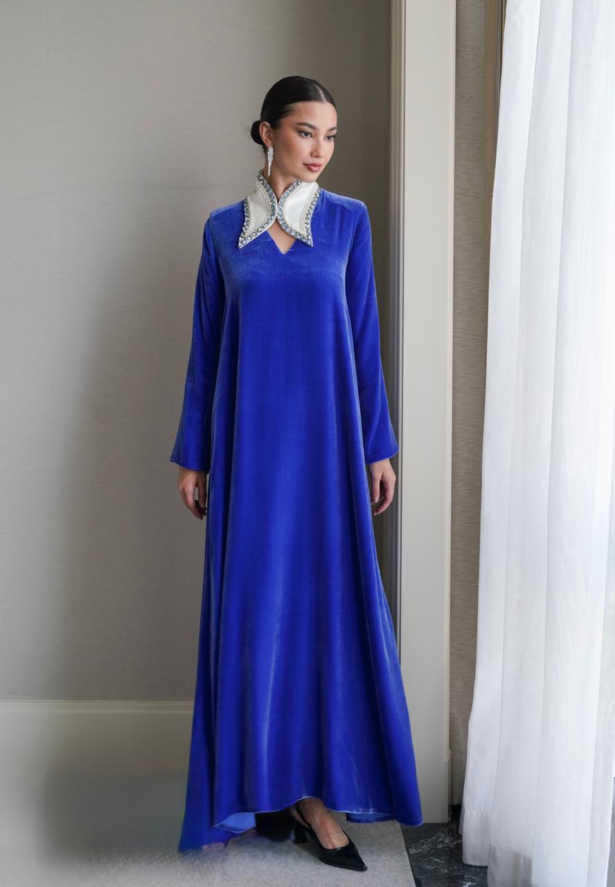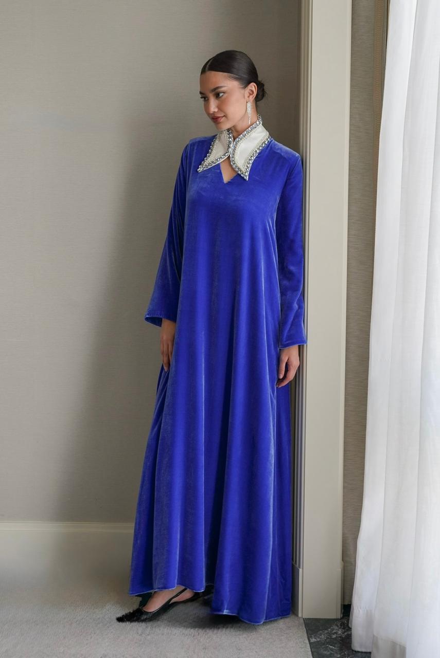 جلابية من المخمل الحريرالطبيعي باللون الأزرق النيلي وياقة باللون السكري مشغولة يدويا” بالكريستال السويسري السماوي والفضي وحبات من الؤلؤ