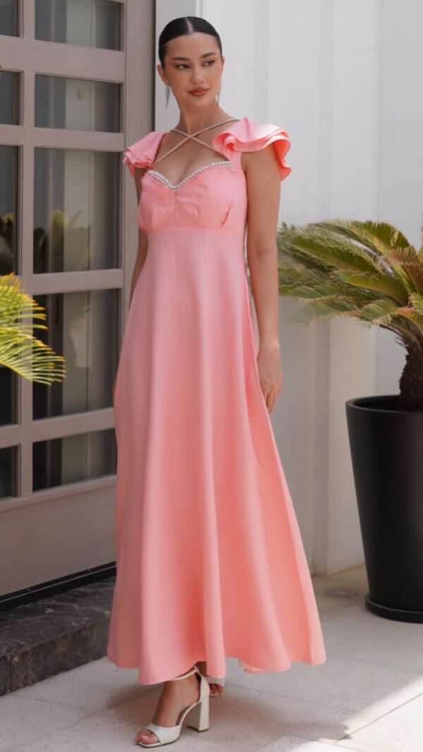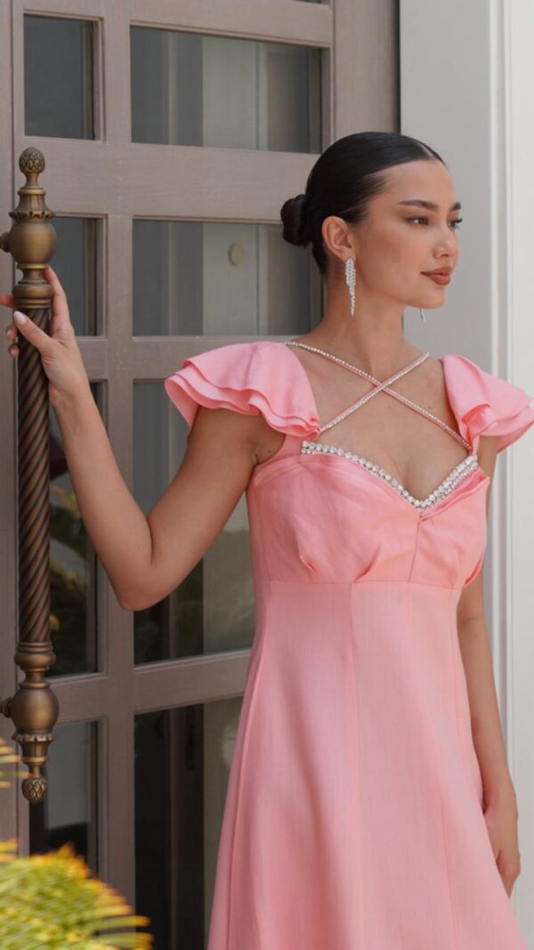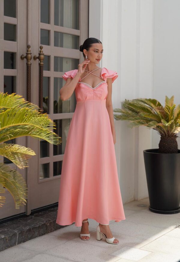 فستان باللون الوردي من قماش اللينن الطبيعي بياقة مطرزة بالكريستال السويسري الفاخر