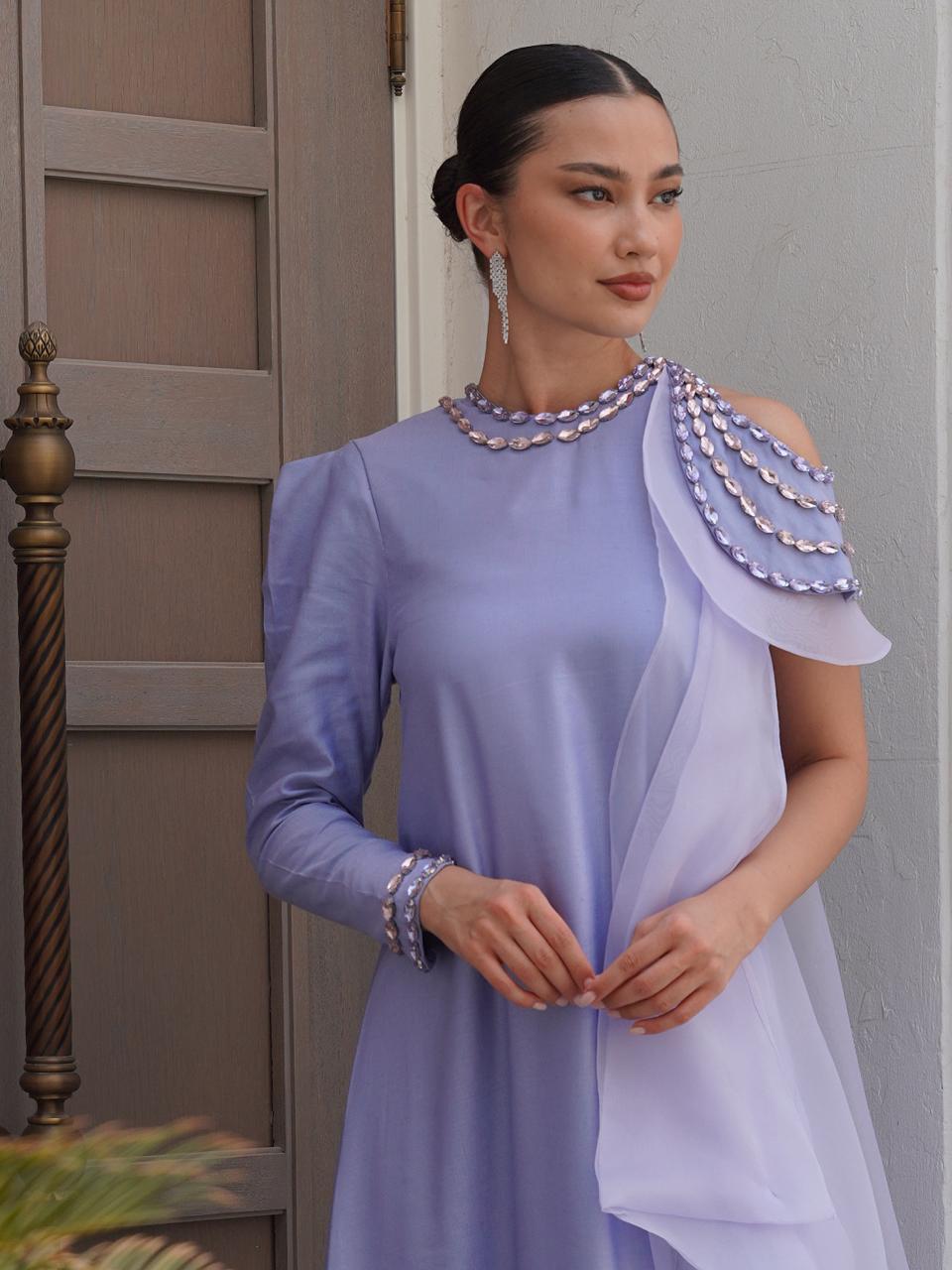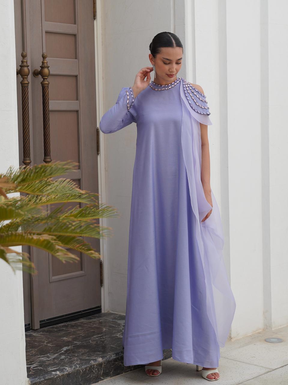 جلابية من قماش اللينن الطبيعي والأورقنزا الطبيعي باللون البنفسجي الفاتح مع كرستال السويسري الفاخر مشغول يدوياً باتقان