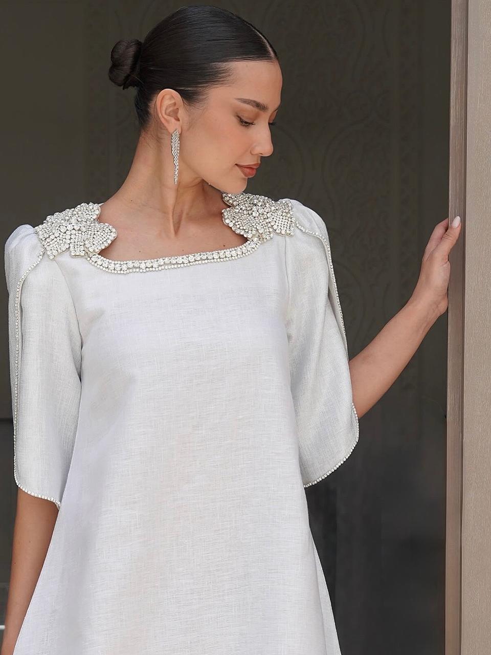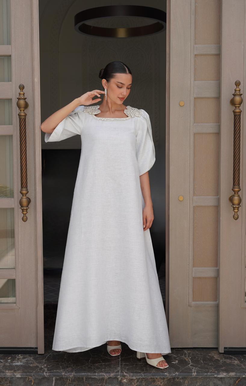 جلابية باللون الابيض الممزوج بالخيط الفضي  بقماش اللينن ومشغولة يدوياً بالكريستال السويسري