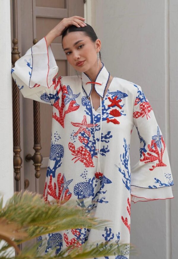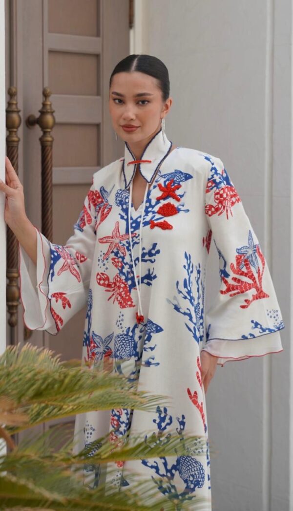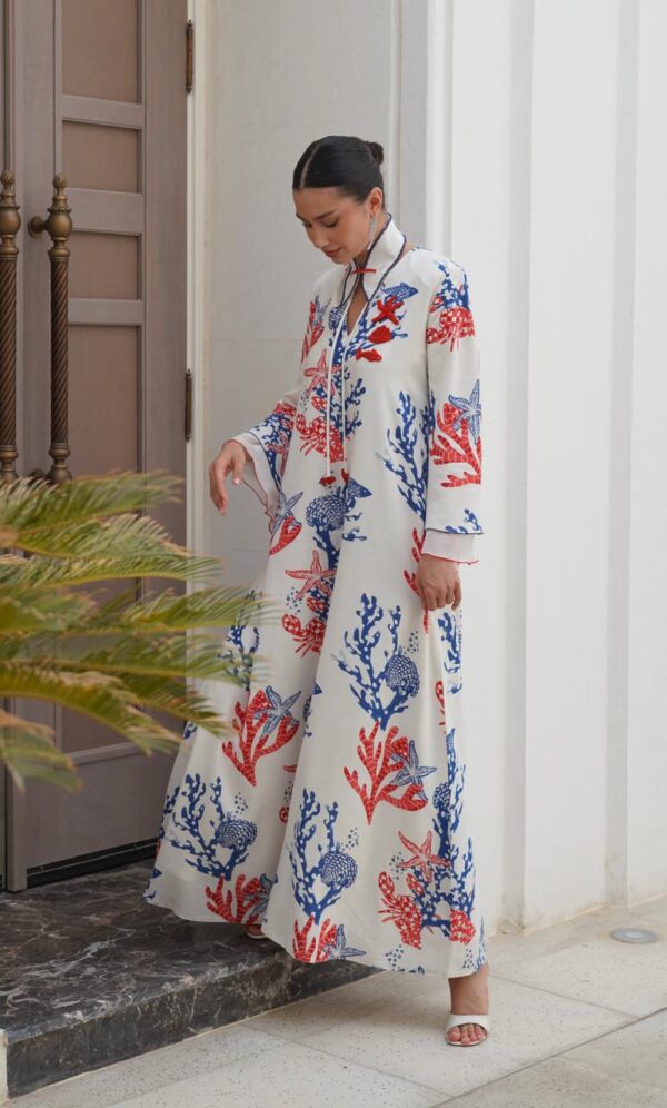 جلابية بقماش اللينن  باللون السكري  برسومات  باللون الأحمر والأزرق مستوحاة من عالم البحار ومشغولة يدوياً بالخرز
