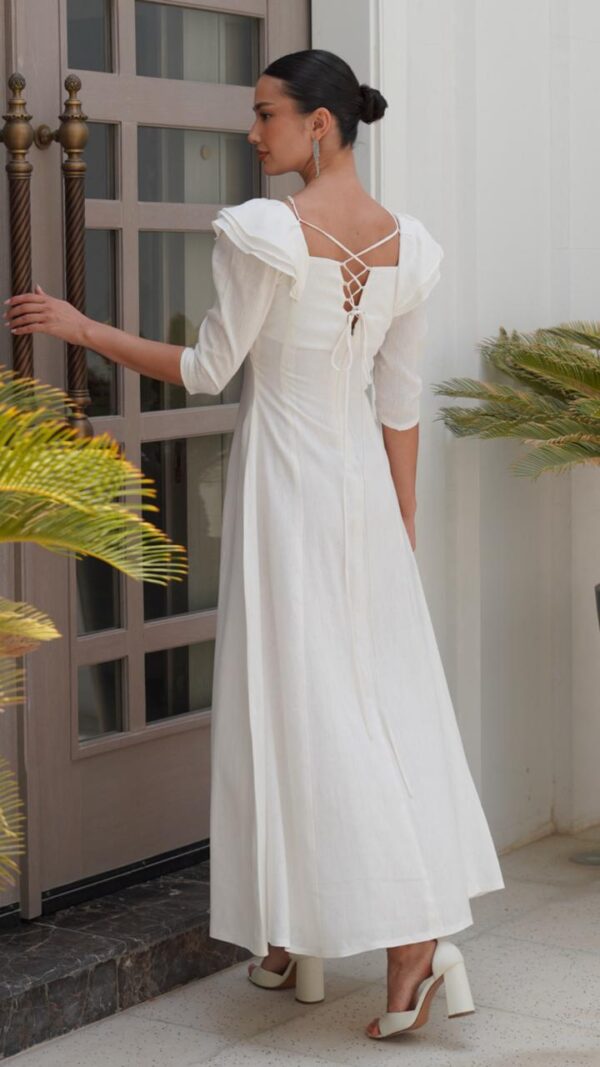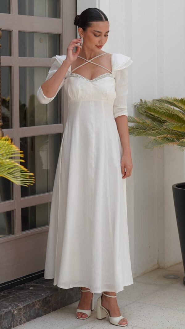 جلابية بقماش اللينين الطبيعي  باللون الابيض مشغولة بالكرستال السويسري الفاخر